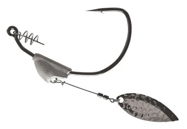 The Owner Flashy Swimmer Beast Version Hooks are a unique setup for rigging soft swimbaits, flukes, and other swimming plastics. The spinner blade is attached to a non-movable weight that keels a rigged soft plastic perfectly for use as an ideal search bait. The flashy swimmer can be used as an alternative to spinnerbaits or crankbaits to cover a lot of water in a short time. Several different presentations can be achieved by switching baits and the speed of retrieval. The added weight helps sink or swim the rigged bait down into the strike zone, while the blade adds a fish-attracting flash. The wire pivots where attached to the weight, but the design of the molded lead keeps the wire and blade riding horizontal during a steady retrieve. Attached to the wire is a number 3 hammered nickel-finished willowleaf blade, rigged with a dual mini swivel.
